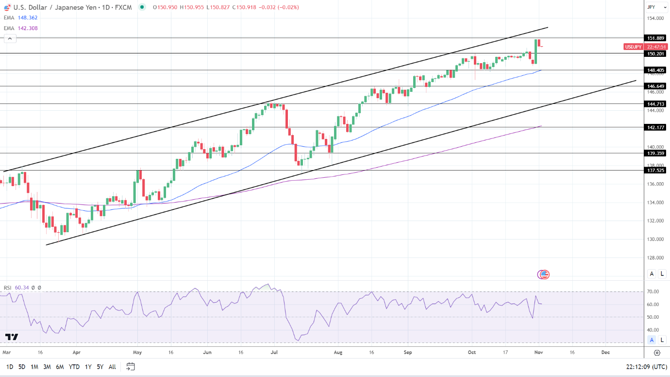 周四(11月2日)亚市早盘,美元/日元跌至150.15,一路从隔夜151.70高点回落。日本干预威胁,以及美联储转向鸽派路径,为日元创造喘息的空间,交易员无法持续站稳151新上限。但技术分析指出,美元/日元仍处于看涨阶段,周五发布的美国非农就业报告(NFP)将成为关键的交锋点。