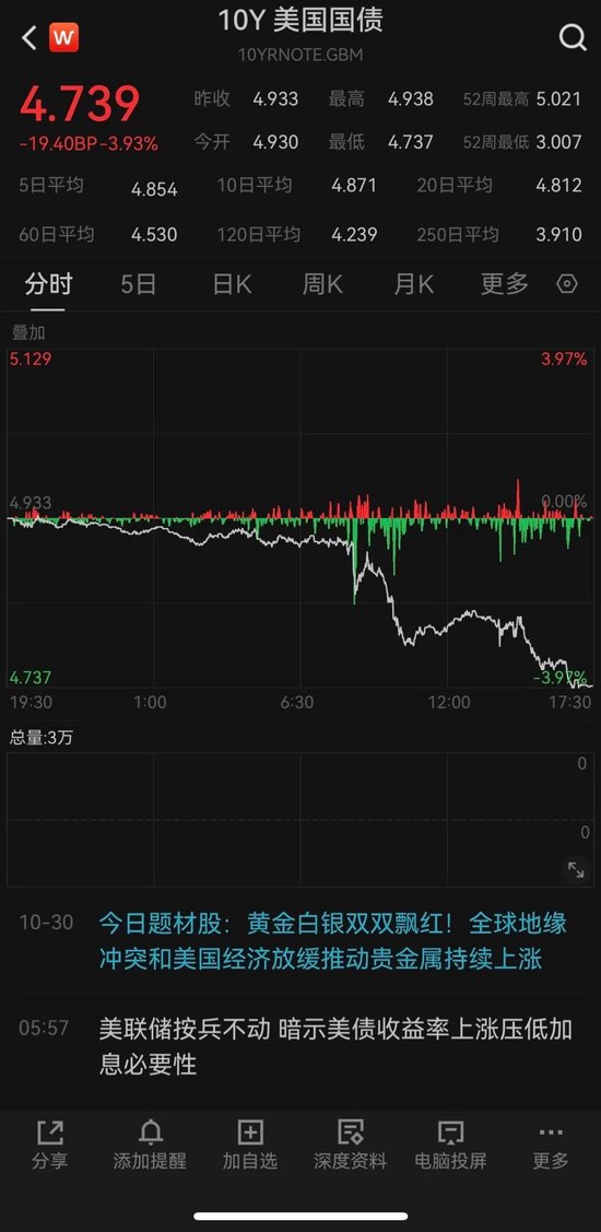 美债收益率全线收跌,2年期美债收益率跌14.2个基点报4.954%,3年期美债收益率跌17个基点报4.759%,5年期美债收益率跌19.6个基点报4.66%,10年期美债收益率跌19.4个基点报4.739%,30年期美债收益率跌16.1个基点报4.932%。