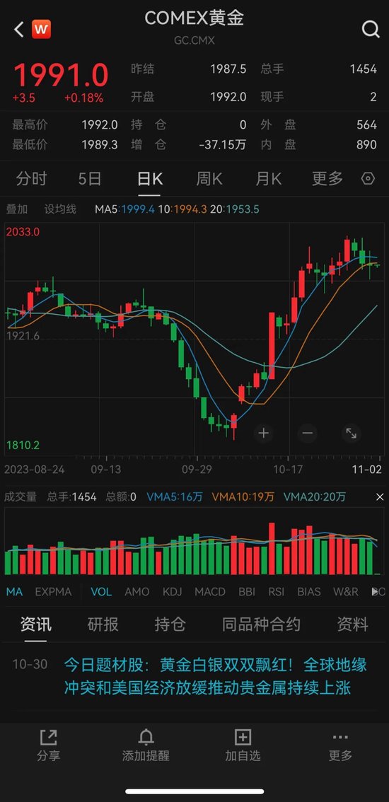 现货黄金价格在鲍威尔讲话期间加速下跌,日内跌0.6%,短暂失守1970美元,为10月25日以来首次,并刷新日低至1969.94美元/盎司。美国两年期国债收益率同样扩大跌幅,刷新日低至4.9561%,日内下跌逾12个基点。