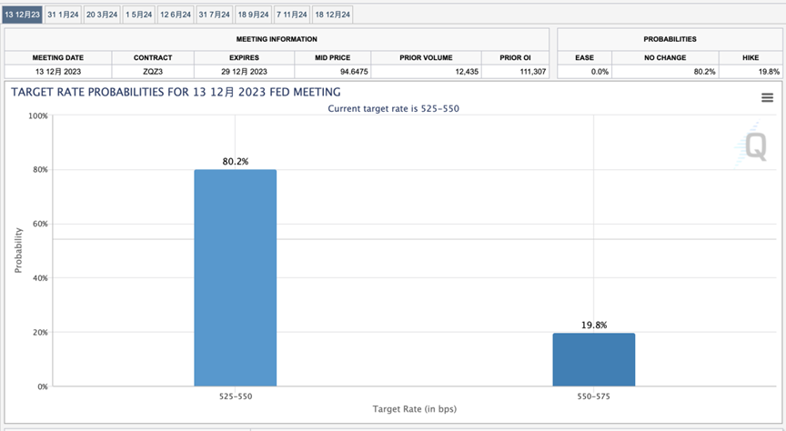 市场分析认为,这是一份倾向于鸽派的声明。连续第二次维持利率不变的事实表明,美联储可能会在12月继续按兵不动。芝商所美联储观察工具显示,目前市场认为美联储12月继续维持利率不变的概率高达80%。