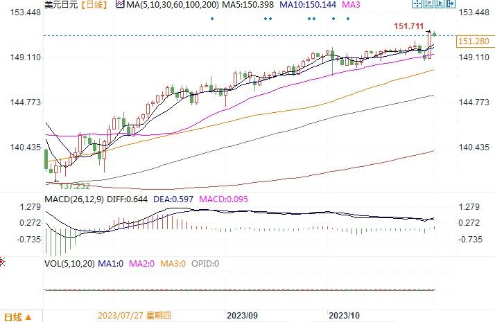 美元兑日元日线图北京时间11月1日14:42 美元兑日元 报 151.280/282