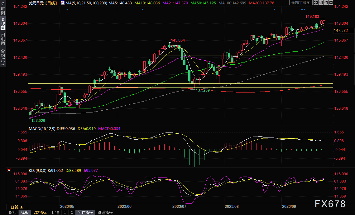 周五(9月22日)亚欧时段,美元/日元小幅冲高,一度刷新逾十个月高点至149.18,目前交投于149.03附近,汇市期待的日本央行“黑天鹅”事件再次落空,日本央行行长植田和男发表超鸽派讲话,强调如有需要,将毫不犹豫地加大宽松措施,无法确定何时会调整政策,为美元/日元多头创造条件。日本央行决议维持-0.1%利率,以及超宽松的收益率曲线控制(YCC)政策不变。