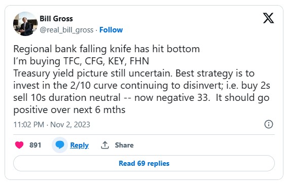 值得一提的是,格罗斯曾在10月30日表示,地区性银行具有“非凡的长期价值”,但希望再等一段时间再买入,希望以60%的账面价值和7%的收益率持有其中一些银行。