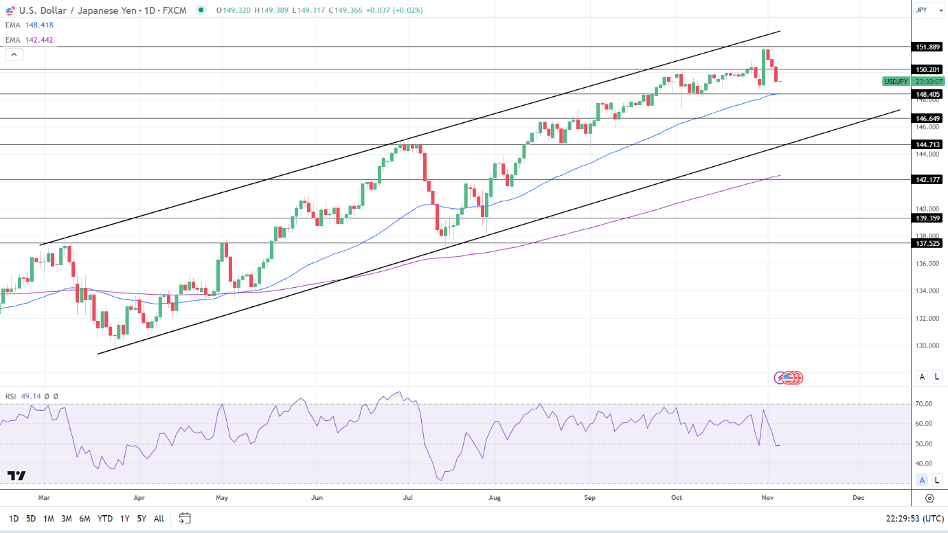 14日RSI为49.14,表明美元/日元将跌破50日均线和148.405支撑位,然后进入超卖区域。