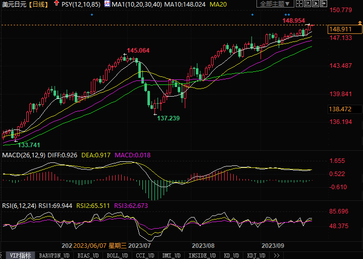 周一(9月25日),美元兑日元触及148.95的10月25日以来最高。此前美联储在上周发出或将进一步加息并可能在更长时间内维持较高利率的信号。而日本央行上周五维持超低利率,并承诺继续支持经济,直到通胀持续达到2%的目标,这表明该央行并不急于逐步退出大规模刺激计划,日元因此受到打击。美联储鹰派的利率前景令美国公债收益率攀升,周一,美国/日本10年期公债收益率差达到382个基点,为11月10日以来最阔。每当我们看到美债/日债收益率差像这样扩大,尤其是10年期公债收益率差,往往会更有力地传导到美元/日元走势-暨套利交易的驱动力将进一步增强。只是由于美元/日元价格离上年日本央行的底线150近在咫尺,对于干预的忧虑可能会迟滞美元/日元的进一步高走步伐。假使日本央行出面干预,但如果美元/日元回落幅度不深,则恐怕更会给予套利交易以更合适的水位继续入多美元。预料短期内交易员仍会试多美元,并将之往150水位推进。