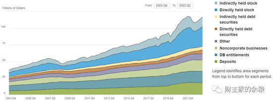 金融资产包括了直接和间接持有的股票、债券、现金、非公司化运营的商业实体、固定收益的养老金以及其他,自2020年1季度到2023年2季度,美国人的金融资产从87万亿美元暴增到了117万亿美元,整整增加了30万亿美元。
