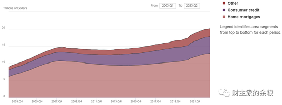 与资产的暴涨相对应,美国民众的负债增加并不多,从2020年1季度到2023年2季度,美国家庭部门总负债仅增加了3.3万亿美元——其中,消费者信贷从4.2万亿,增加到4.9万亿,住房抵押贷款,从10.5万亿增加到12.8万亿,其他债务从2万亿增加到2.3万亿。