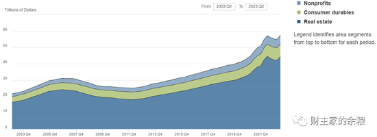 非金融资产包括非营利性资产、耐用消费品和房地产,从2020年1季度到2023年2季度,这些资产的总额从40.5万亿美元增加到57.5万亿美元,净增加了17万亿美元——其中,房地产资产规模从30.5万亿美元增加到44.5万亿美元,净增加了14万亿美元。