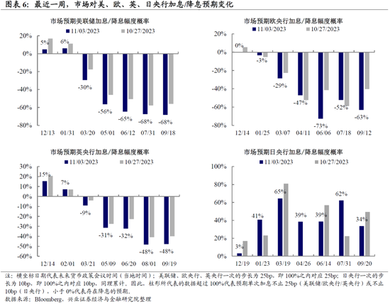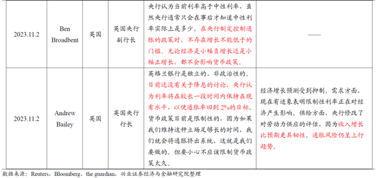 英国:英央行如期维持利率不变,开放进一步加息的可能性。11月2日,英央行发布利率决议,以6比3的投票结果如期维持银行利率为5.25%不变(三名反对票官员认为应加息25bp)。暂停加息一方面来自通胀前景,委员会预计通胀将大幅下降,四季度降至4.75%,明年一季度降至4.5%,服务通胀预计从2024年1月开始下降;另一方面的考量来自经济压力,预计三季度GDP增速为0%,四季度增长0.1%,均低于8月的预测。然而,通胀风险仍倾向于上行,英央行并未排除未来继续加息的可能,认为服务通胀“尚未出现有意义的回落”;劳动力市场摩擦更为持久,可能阻碍劳动力市场的松动,不利于工资增速的回落。