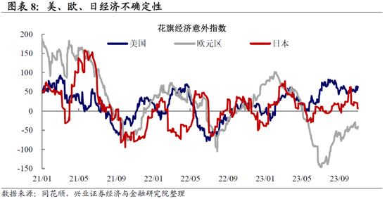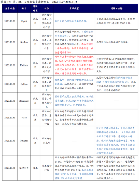 欧元区:经济放缓、通胀回落,但对货币政策转向的观察或至少持续至明年上半年。欧元区经济放缓,三季度季调后GDP季环比初值-0.1%,前值为0.2%;通胀再次大幅回落,10月调和CPI同比下降1.4个百分点至2.9%,主要受到能源和食品的大幅拖累,核心商品和服务也小幅放缓。欧央行多位官员本周暗示加息已结束,但仍需维持高利率以发挥紧缩作用,是否达到降息条件可能至少要观察到明年上半年。