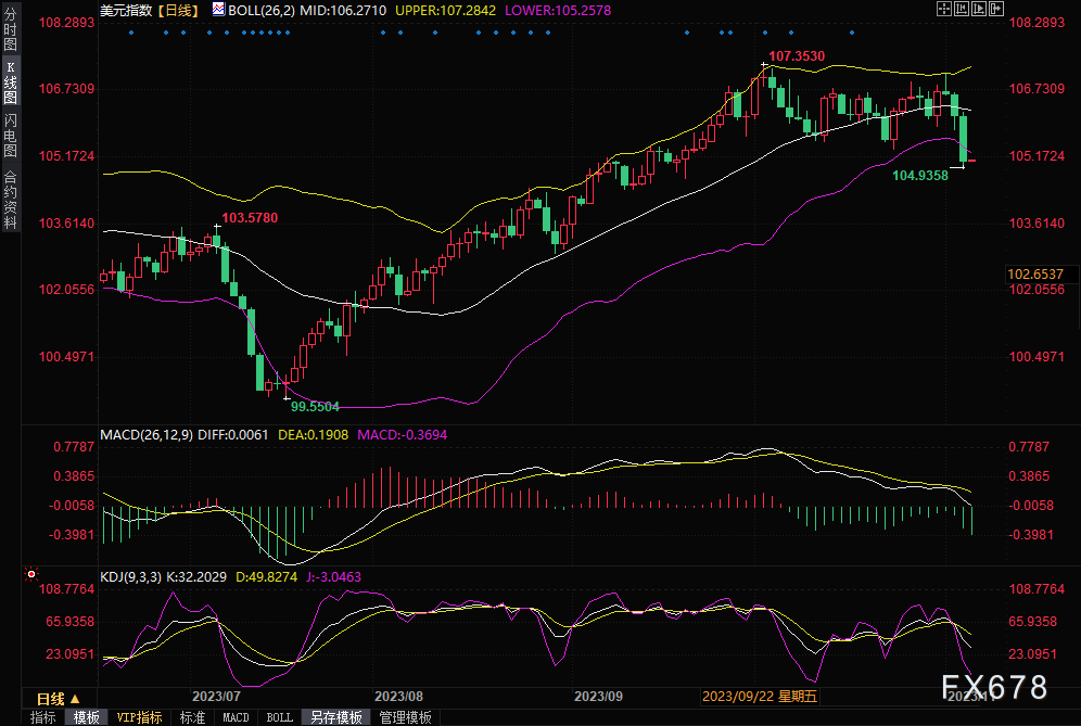 自周初震荡反弹一度突破107关口,最高触及107.11,随着美联储鸽派暂停,暗示可能结束激进的紧缩周期,美指周三自高位急剧回落,随后接连失守106以及105关口,周五更是在爆冷非农的影响下暴跌超100点,最低触及104.94水平,为9月20日以来新低,当周勉强收于105关口上方,周跌幅超过150点,或1.42%,为7月中旬以来最大周跌幅。