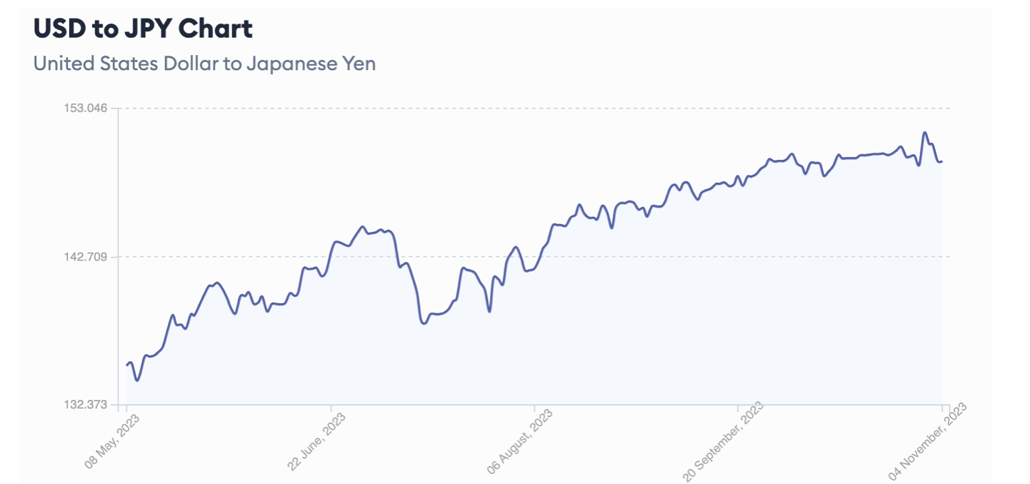 重回货币政策正常化的进一步延后也导致日元进一步走弱。11月1日至3日,东京外汇市场上的日元汇率连续三日跌破1美元兑150日元关口,最低探至1美元兑151.7日元,不仅刷新了去年10月的最低水平,这也是日元32年来的最低点。