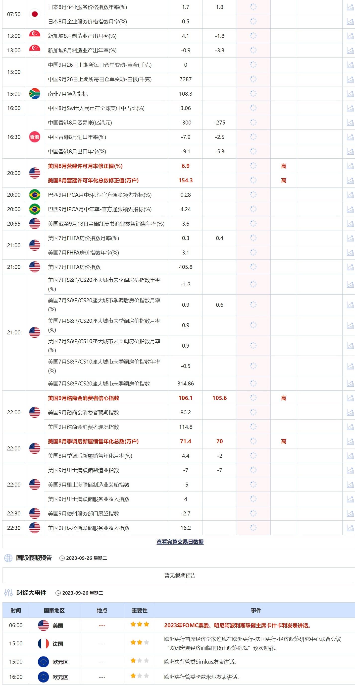 9月26日,需关注的重点数据包括美国8月营建许可月率修正值,美国8月营建许可年化总数修正值,美国8月季调后新屋销售年化总数,美国9月谘商会消费者信心指数。 需关注的大事包括欧洲央行管委卡兹米尔发表讲话,欧洲央行管委Simkus发表讲话。
