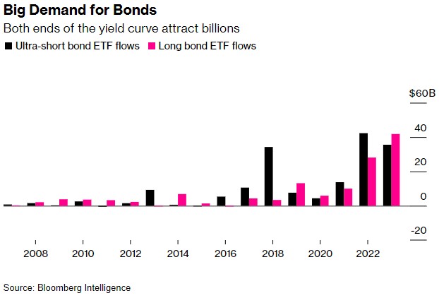 智通财经注意到,今年,创纪录的大量现金涌入美国国债收益率曲线的两端,要么寻求抓住20多年来最高的短期利息支付,要么寻求在利率最终见顶后从长期债券的反弹中获利。不同的赌注似乎都将同时获得回报。