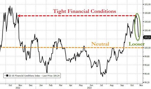 但颇为讽刺的是,仅仅一周多的时间后,随着美国股债市场的携手大涨,美国金融市场的环境已再度迅速转向宽松,高盛金融状况指数的变动就能很好的反映这一点。