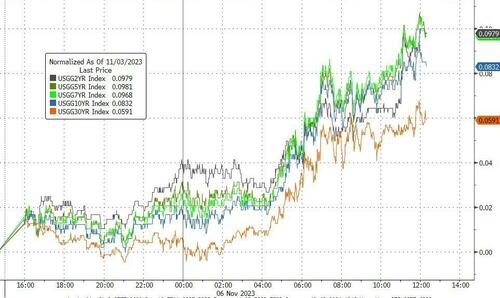 行情数据显示,各期限美债收益率隔夜普遍走高。其中,2年期美债收益率上涨10.2个基点报4.947%,5年期美债收益率上涨9.2个基点报4.596%,10年期美债收益率上涨7.8个基点报4.65%,30年期美债收益率上涨4.9个基点报4.812%。