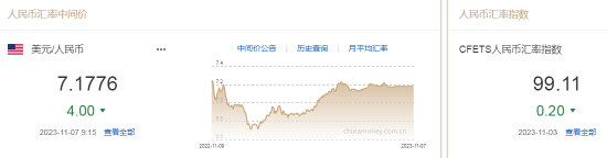 11月7日,人民币中间价报7.1776,上调4点,上一交易日中间价报7.1780。