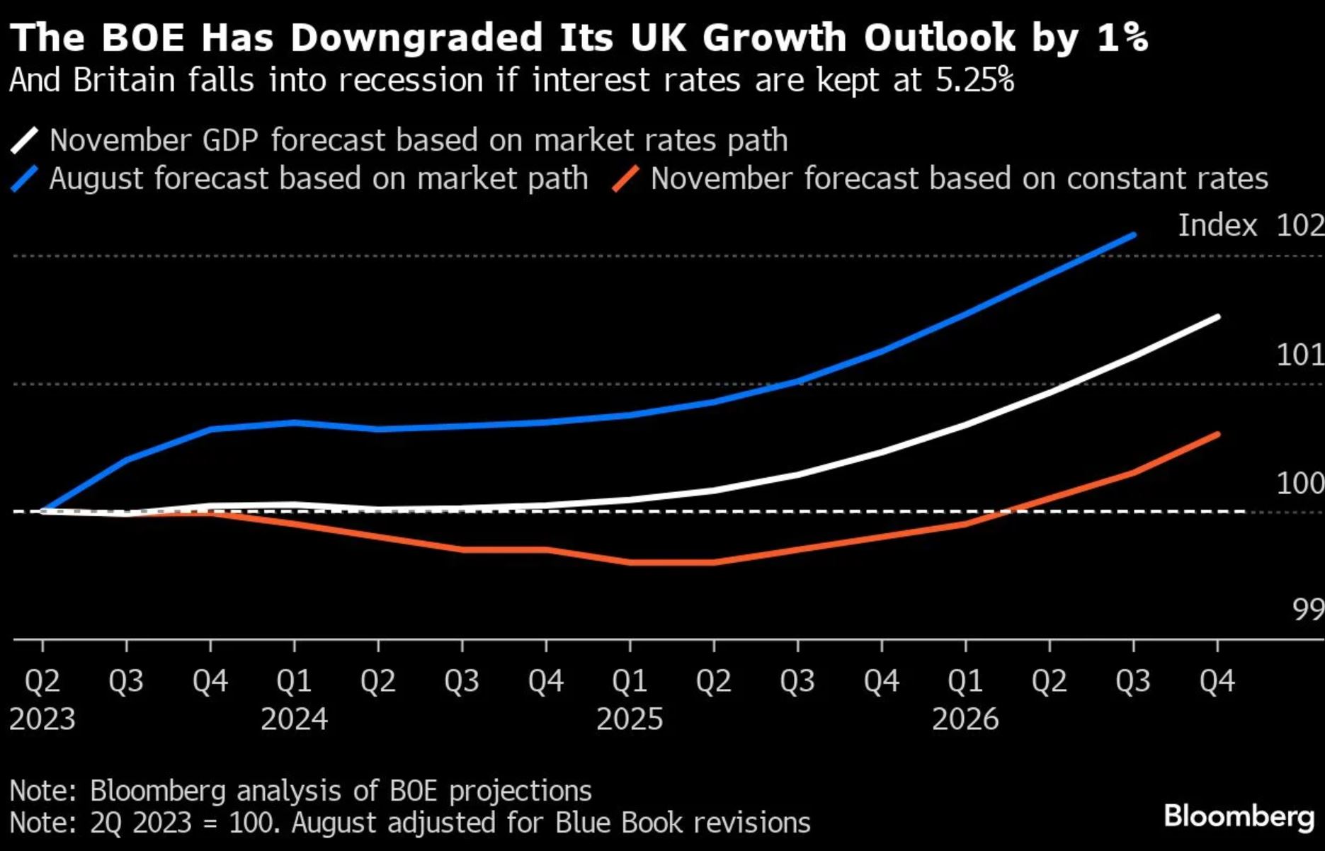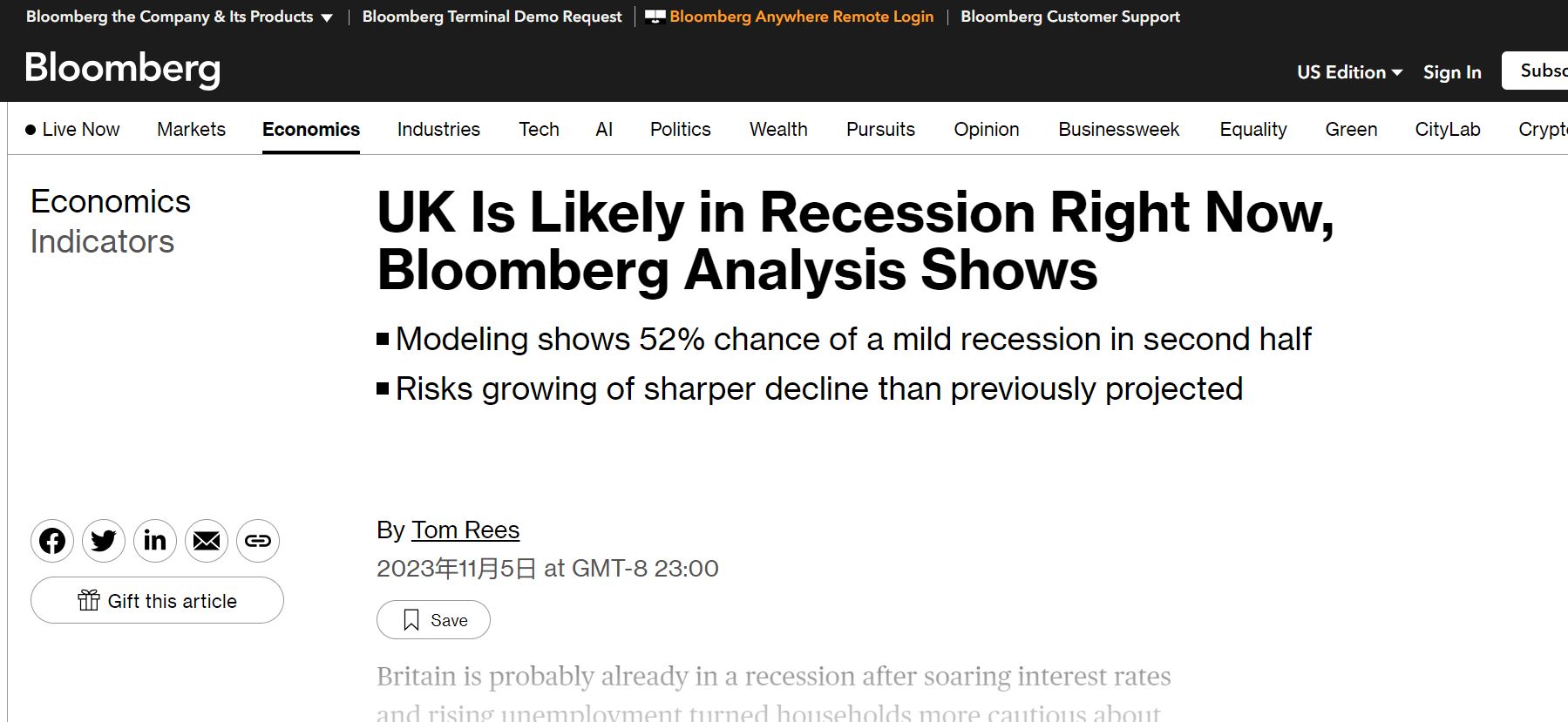 彭博经济研究公司的分析,由于利率飙升和失业率上升使家庭对支出更加谨慎,英国可能已经陷入衰退。