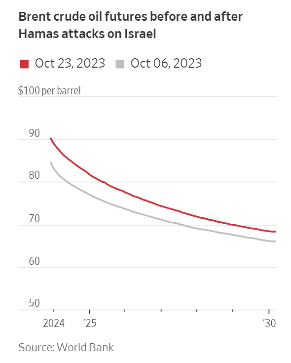 以以色列和哈马斯之间的冲突为例。暴力事件可能导致石油资源丰富的中东地区爆发更广泛的战争。世界银行上周发布的一份分析报告警告称,在最坏的情况下,油价可能从每桶85美元左右升至每桶150美元。如此高的油价可能会在更大范围内重新引发通胀,迫使美联储进一步加息。这将导致债券收益率上升,价格下跌。