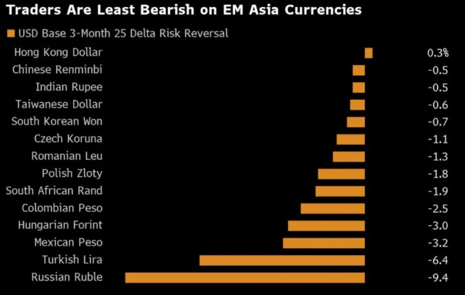 这反映出,在经历了投资者受挫的一年之后,新兴市场外汇市场出现了大幅反弹。特别是在亚洲,一些指标反映出早期的乐观情绪。彭博汇编的三个月风险逆转数据,在期权市场,交易商对人民币、台币、韩元和印度卢比等货币的看跌程度最低。亚洲货币表现也相对平静。在过去30天里,人民币、印度卢比和马来西亚林吉特的汇率波动最小。