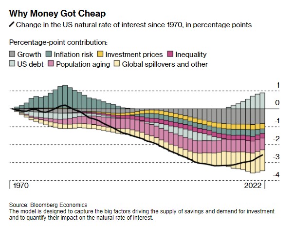 人口结构的变化也起到了另一种作用。从20世纪80年代开始,随着婴儿潮一代开始为退休储蓄更多的钱,储蓄的供应量随之增加,这给中性利率带来了更大的下行压力。