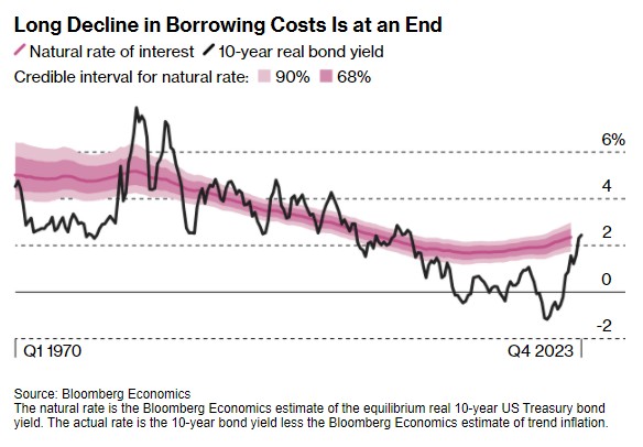 高政府借贷、应对气候变化的更多支出以及更快的经济增长都将推高中性利率。根据估计,综合影响将把中性利率推高至4%,换算成10年期美国国债的名义收益率则约为6%。
