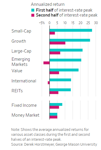 对此,乔治梅森商学院的金融学教授Derek Horstmeyer认为答案很简单:股票——尤其是小盘股和成长型股票,是在利率达到峰值然后趋于平稳期间表现最好的资产类别。