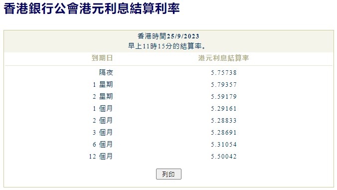 9月25日,港元拆息全线上扬。香港银行公会数据显示,隔夜息跳涨近67基点,触及5.75738%,至少创逾17年新高。一周期亦创近16年高,而两周拆息升至5.59179%,为2007年10月以来最高。另外,与楼按相关的一个月拆息亦微升至5.29161%,逼近5.3%,结束三连跌。反映银行资金成本的三个月拆息连升两天,今报5.28691%,续创一个半月新高,较同期美元LIBOR低近15基点。
