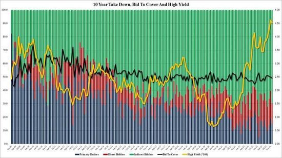 美国国债是世界上规模最大、流动性最强的市场之一,技术上说美债标售不会流拍,一级交易商将保证他们以任何价格购买这些债券。但如果一级交易商的购买量增加,就意味着标售需求下降,因为竞购者比之前减少,一级交易商就得吸纳更多的剩余债券。