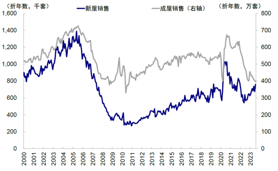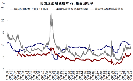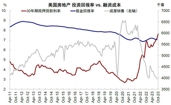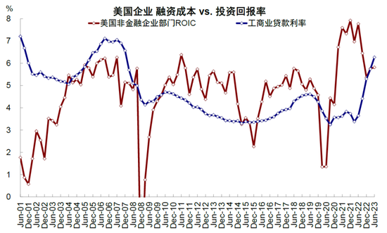 ► 新增:融资需求已受抑制,企业和居民当前融资成本都已经超过投资回报率。1)企业部门:企业债利率(投资级债券6.5%,高收益债券9.3%)、工商业贷款利率(6.3%),这两者衡量的加杠杆融资成本都已经超过了投资回报率(标普500非金融部门ROIC为5.8%)。2)居民部门:30年期房贷利率已经达到8%,而租金投资回报率仅有7%。从结果上看,无论是信用债发行、工商业贷款规模还是美国地产销售(成屋为主)都在明显回落。