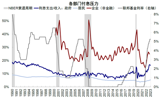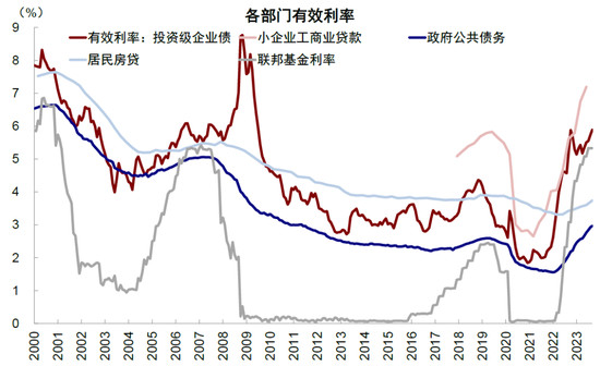 美国紧信用缓慢是因为广义投资回报率一直高于融资成本,同时高利率对存量锁定的付息压力传导有限。不过这一情形已有改变:1)增量:高利率已开始抑制各部门新增需求,如中小企业工商业贷款、大企业信用债发行,居民房贷和消费贷都出现不同程度萎缩。2)存量:由于利率锁定效应,除企业8%已较高外,政府平均2.9%和居民3.6%的存量有效利率都不高,居民利息支出占收入比也维持低位。这意味着与增量相关的企业投资、居民购房会受到抑制,但与存量相关的消费影响不大,何况还有较高的超额储蓄。政府杠杆虽不受此约束,但除非再出现意外风险,否则大选年很难扩张。