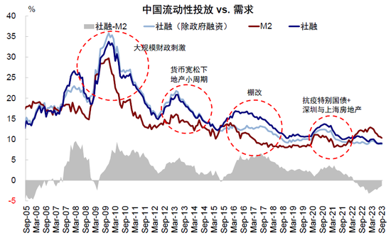 正如我们自《全球市场2023下半年展望:软着陆与慢爬坡》以来多次强调,中国增长当前面临的约束不在于融资成本,而是更低的投资回报率预期抑制甚至阻断了信用周期的开启,这也导致了充足的流动性并未有效转化为投资和消费,而是更多淤积在居民和企业储蓄上,进而形成了当前“宽货币、紧信用”的局面。因此,如何推动宽信用开启就成为了短期解决增长的关键。