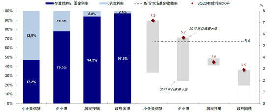 图表2:美国居民及政府存量债务中固定利率占比为主导,企业固定利率占八成、小企业浮动利率超五成;居民和政府有效利率偏低,企业、尤其是小企业,有效利率已然偏高