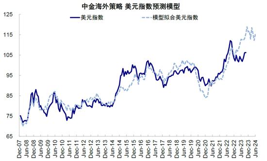 图表21:模型结果显示,未来半年美元指数维持震荡,趋势拐点看非美经济体的扩张速度