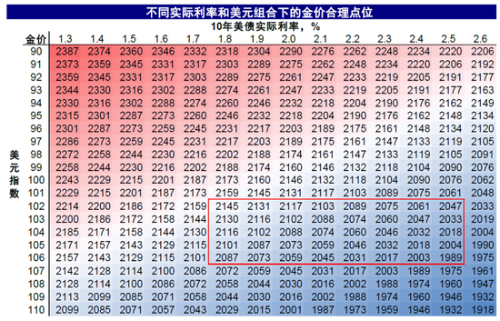 图表20:按实际利率1.8%~2.5%,美元指数102~106,黄金合理中枢为2050美元/盎司
