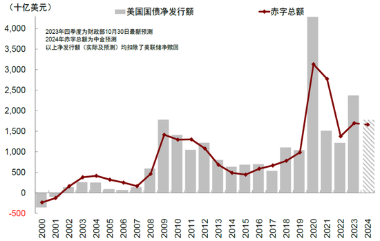 对于第二个问题,由于明年是大选年,基本赤字很难大幅扩张(尤其是总统和众议院分属不同党派),且明年债券到期规模与今年基本持平,而TGA回补也已完成,因此除非再度出现类似于银行风险的意外事件,财政信用也很难大幅扩张。我们测算,2024财年赤字规模约1.66万亿美元,对应2024年美债净发行1.78万亿美元,远低于2023年。